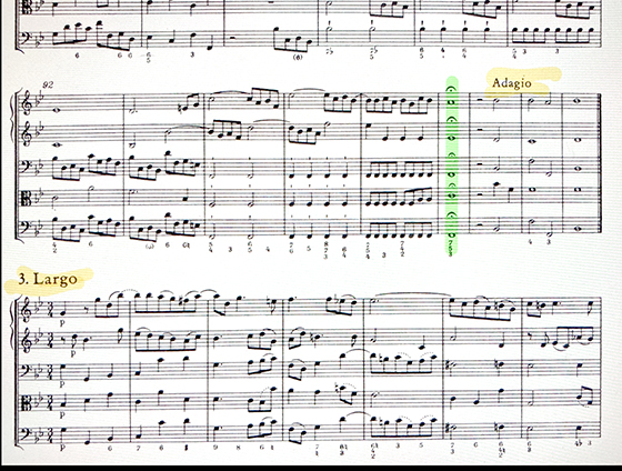 このように特に難易度も高くない曲なんですが、先程のアンサンブルの話でいくと、1のLargoから2のAllegroへ行くところ。こういうところでアンサンブルのみで演奏する時は、必ずコンサートマスターを見るとか息を合わせるとか、ようするにアイコンタクトが必須になります。